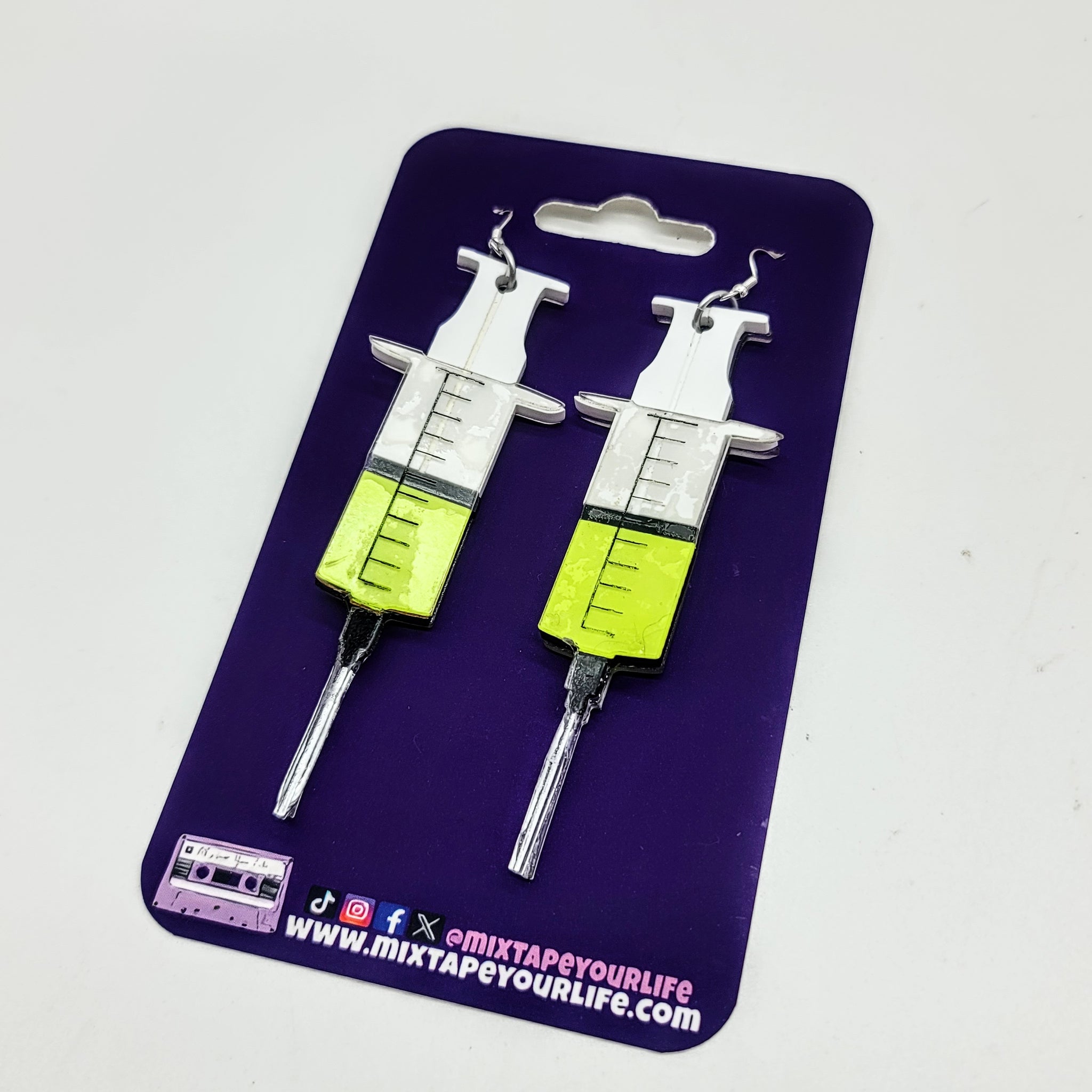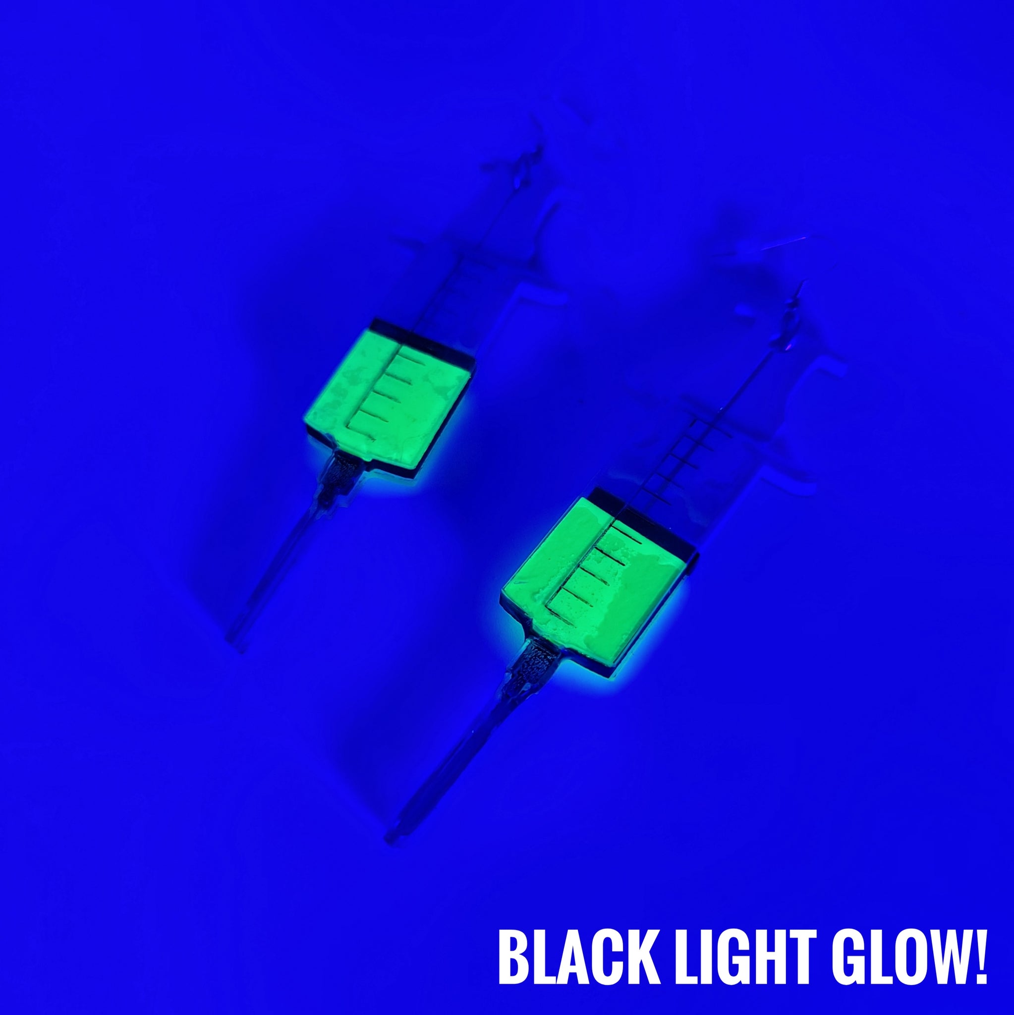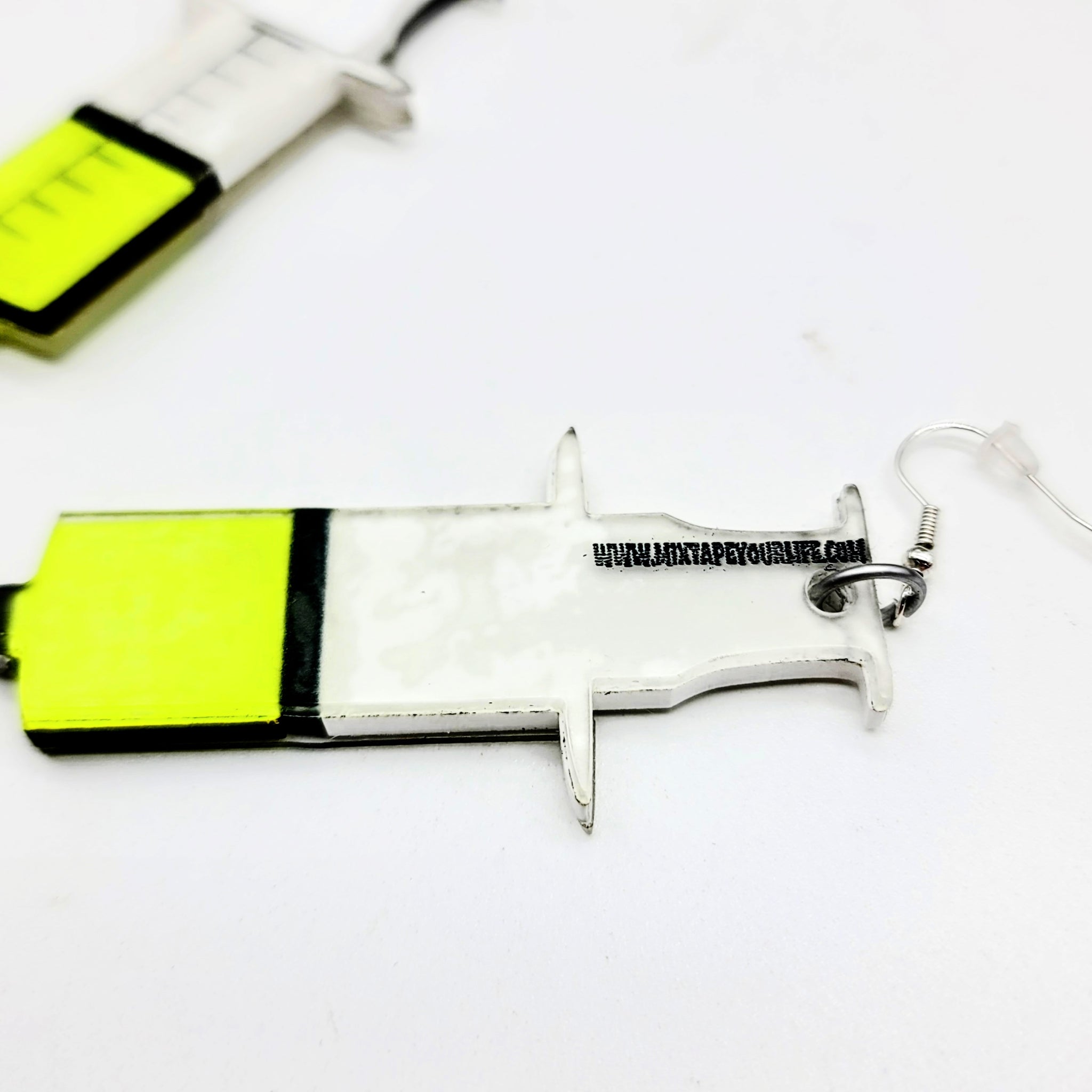 These earrings are inspired by the movie Re-Animator. Made from a combination of laser cut cast acrylic and colorboard these syringe earrings are a must for any horror fan! The florescent yellow inside the syringe actually glows vibrant in black light!