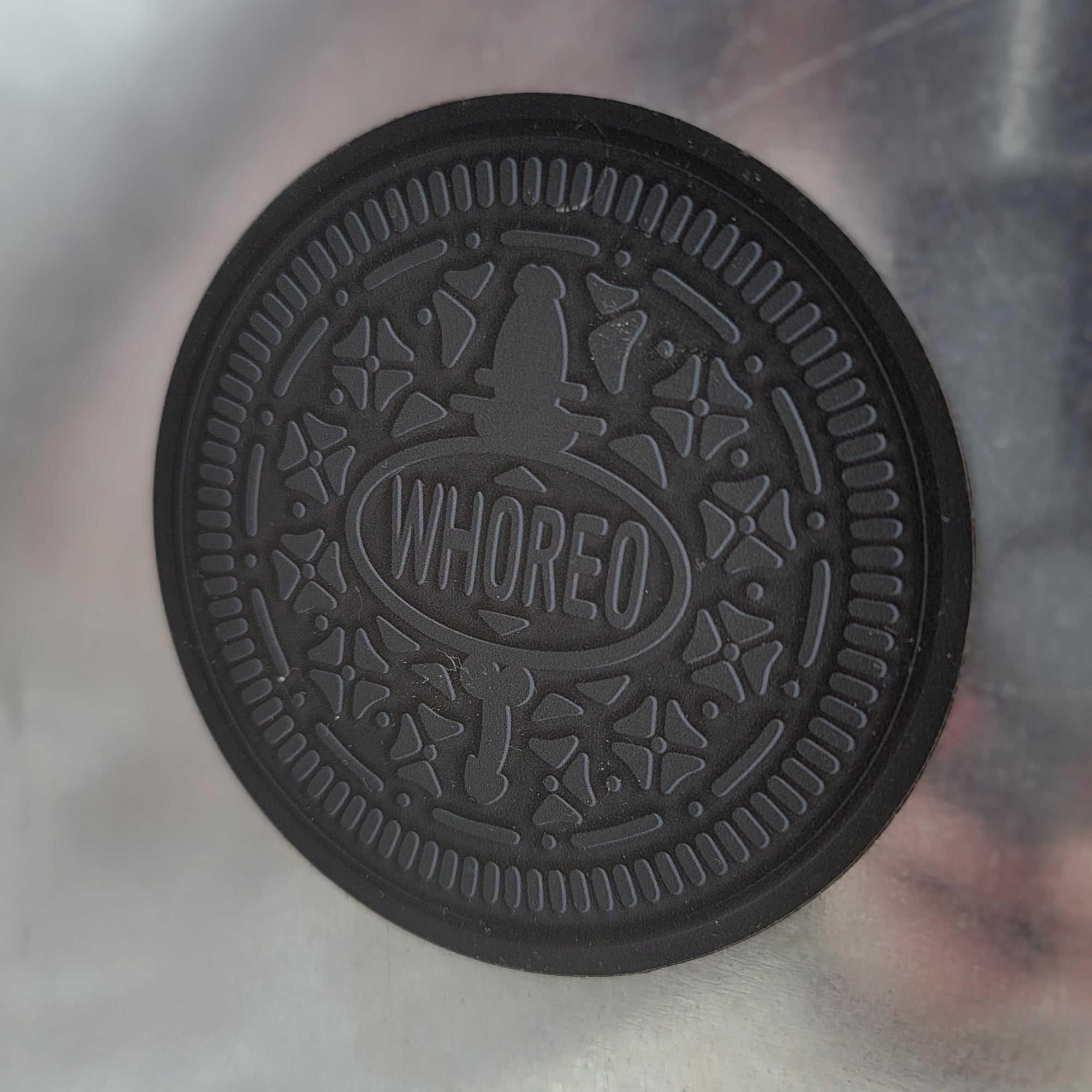 Add a little naughtiness to your fridge décor with this tongue-in-cheek cookie-inspired magnet. Designed to resemble a certain famous chocolate sandwich cookie (but with a much spicier sense of humor), this parody magnet features the word Whoreo in a stylized embossed affect in the center.