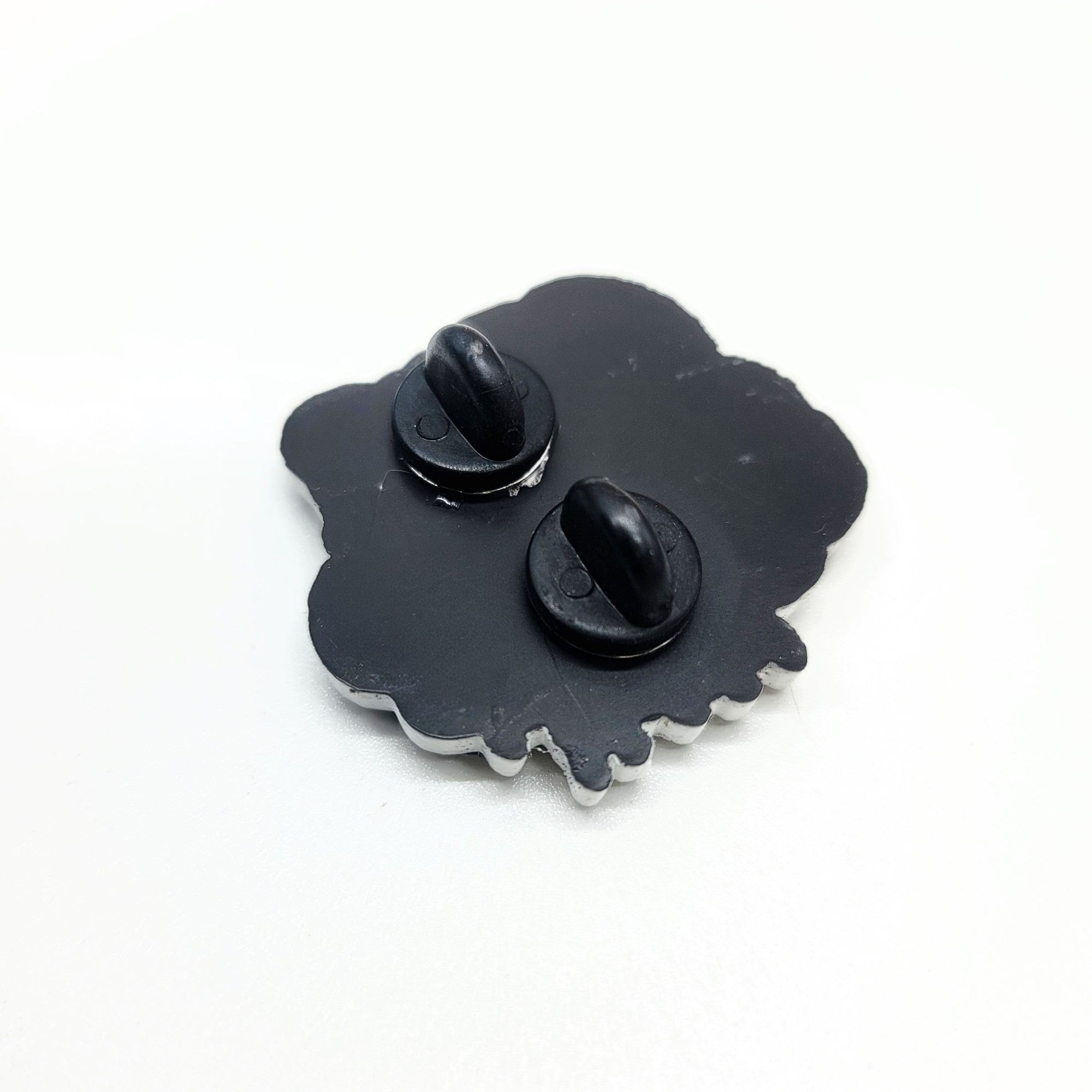 Handmade lapel pin, laser cut from 2 tone black and white specialty plastic, then resin domed to give it a super glossy look.