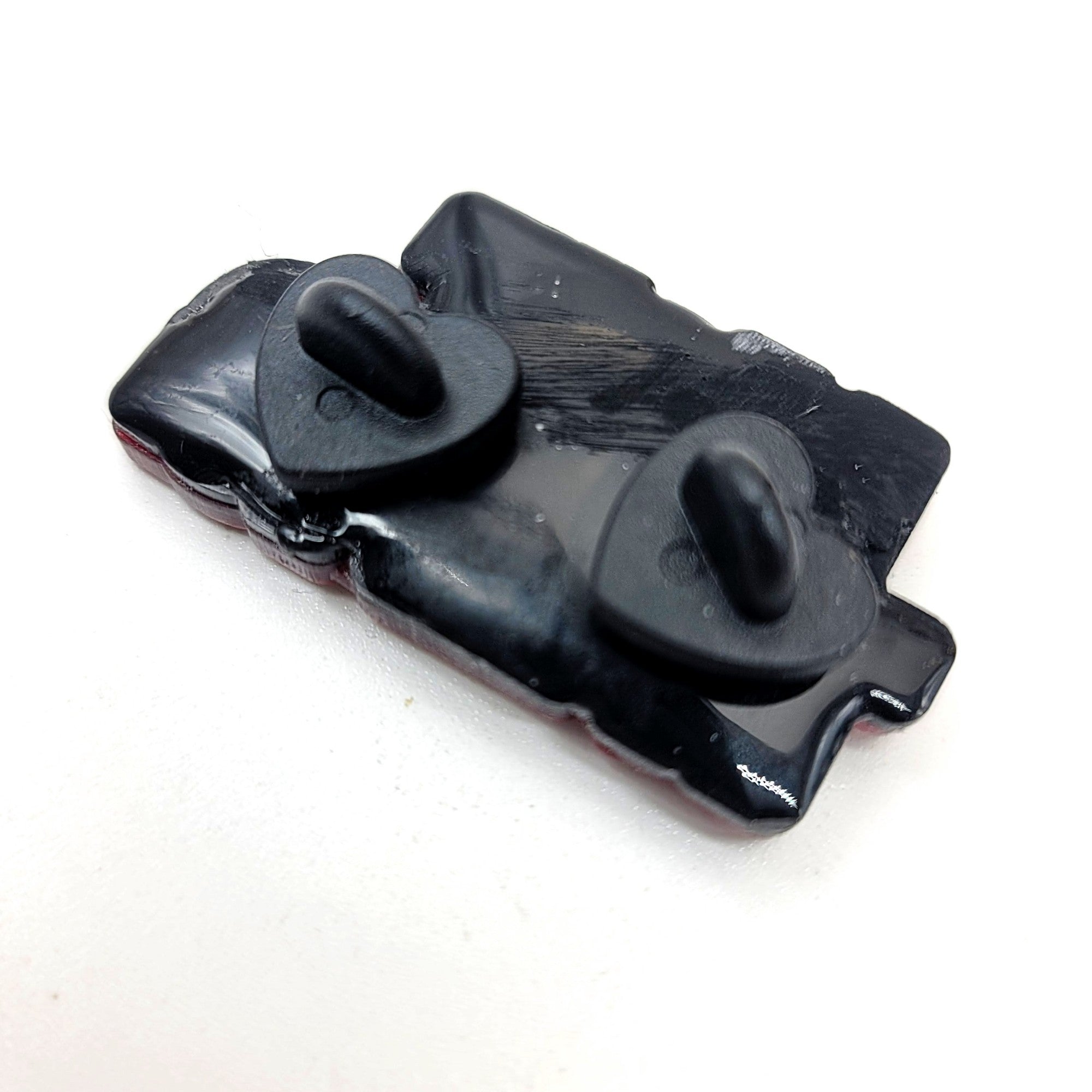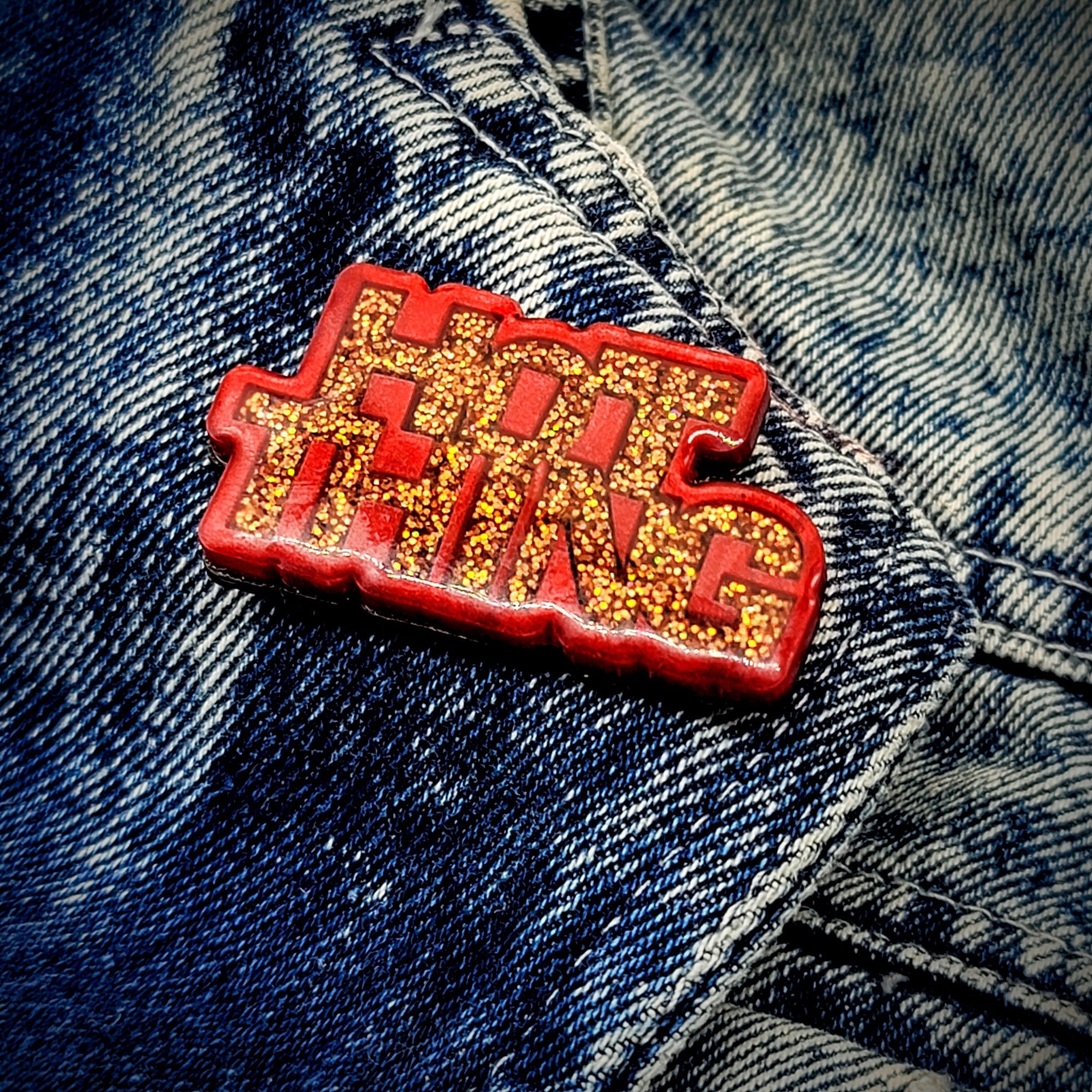 This handmade lapel pin is made from two different colors of laser cut acrylic (a glitter copper and metallic red), and a glossy resin top coat to really make it pop! Double post pin backs and black rubber post clutches!