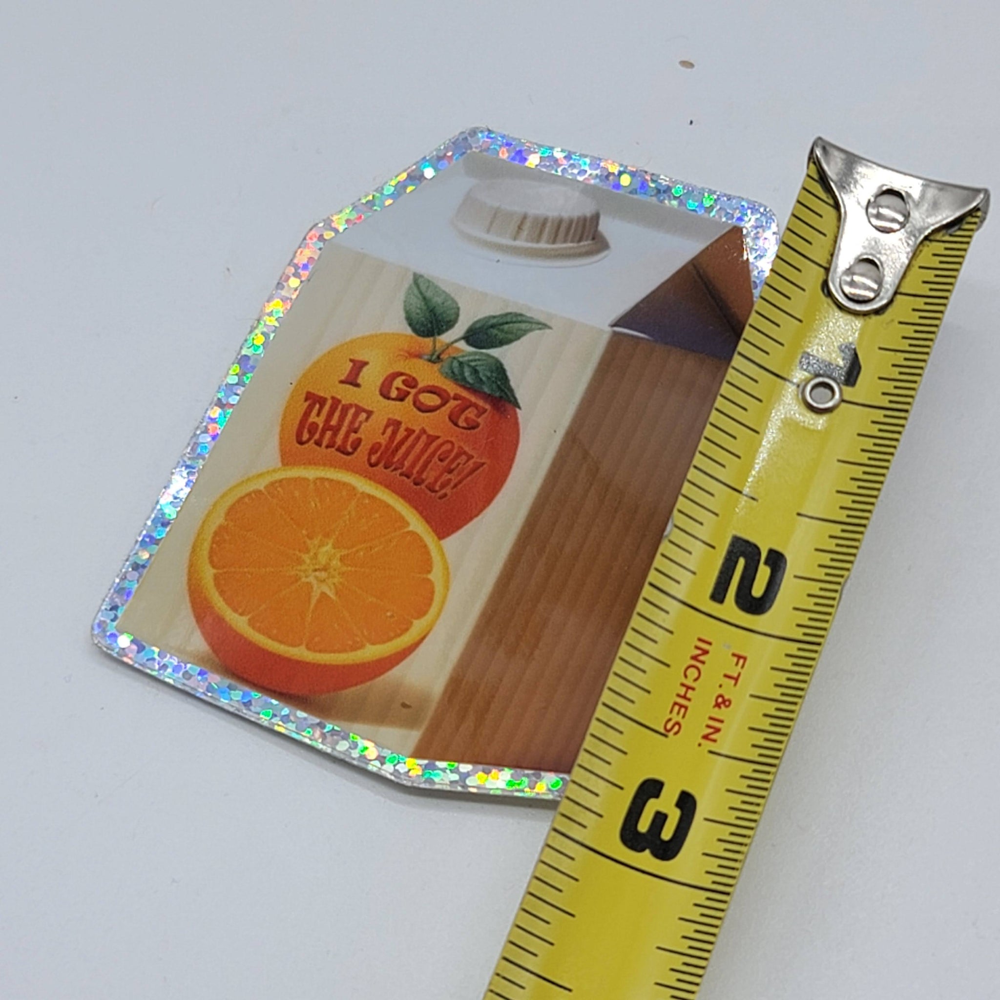 Channel your inner groove and show you got the juice with this fun, sparkling vinyl sticker inspired by the song of the same name by Janelle Monáe. This glossy, glitter-bordered sticker features a stylized orange-juice carton design with full-color artwork of fresh oranges and bold retro text reading “I GOT THE JUICE!”