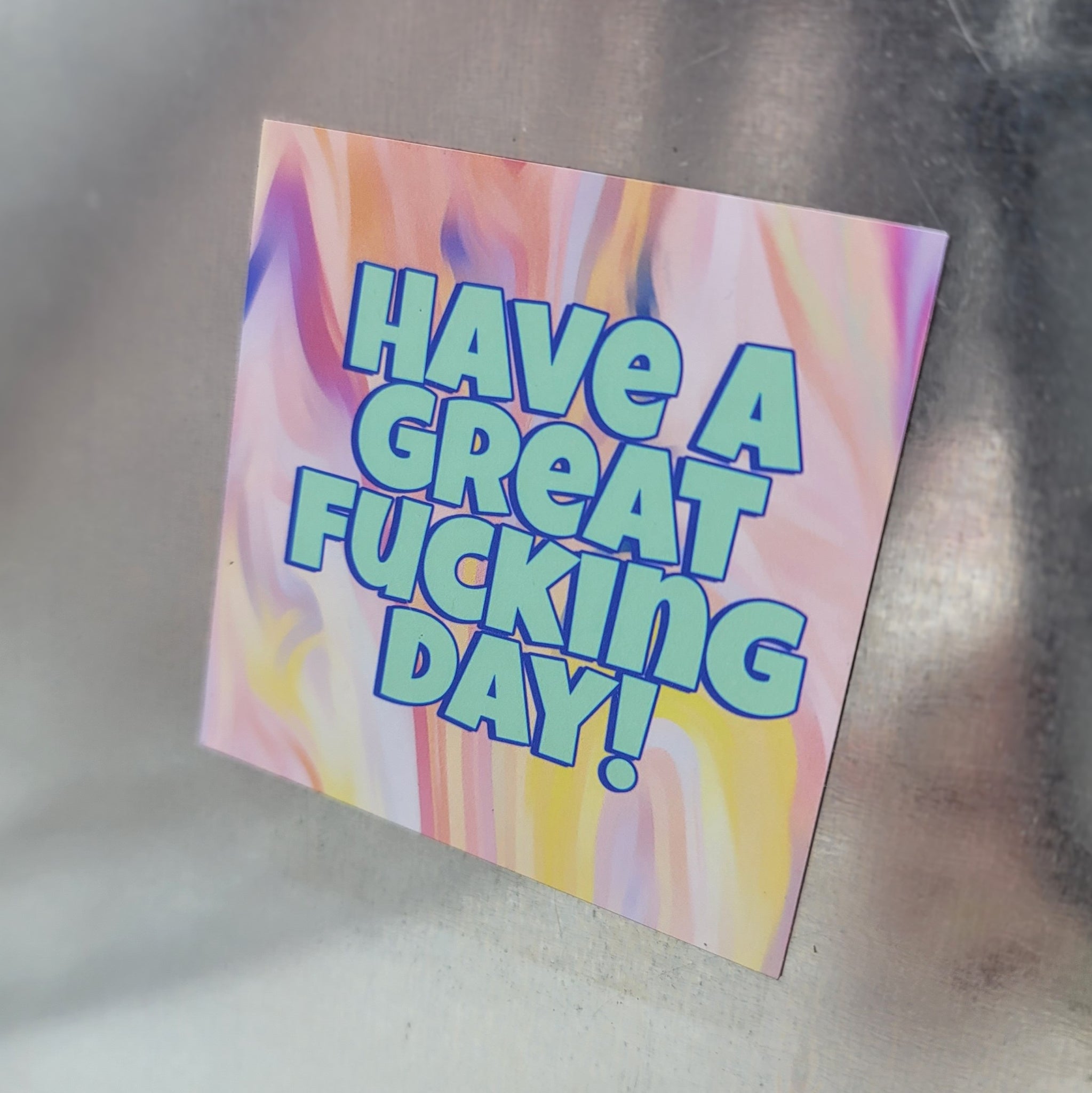 Premium magnet measures 3 inches with a pastel swirl background and seafoam green text that says "Have A Great Fucking Day!"